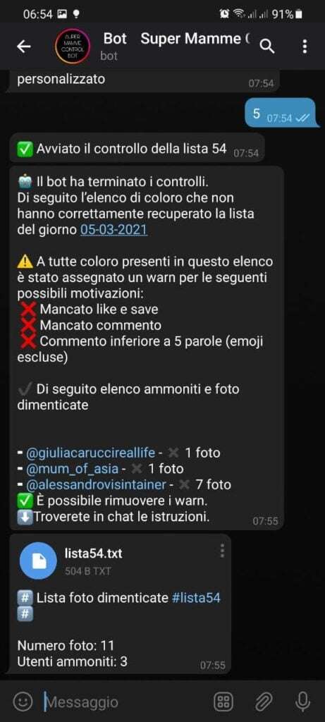 At the end of this check, a list of all the users that missed some photos will be sent in form of a Telegram message (and inside a handy .txt you will get the full list of missed photos for each user).