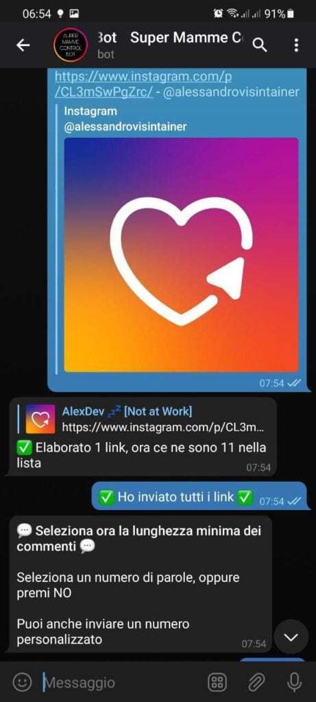 AlexDev.ITcreated an Instagram Lists Checking Bot, customised for a client, able to entirely check Bombing or Round Exchange groups, for Likes and/or Comments, managed through lists, with advanced filters, premium users, and much more