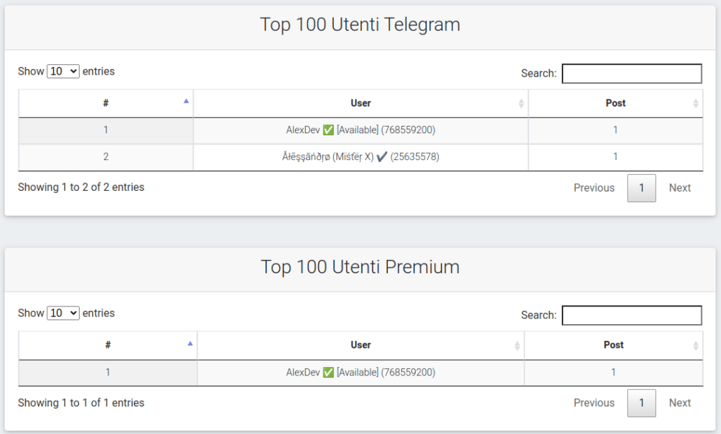 We have updated all the Top 100 tables, which can now be filtered, reordered for each of the columns provided, searched by user ID and username, and navigated through the various pages.