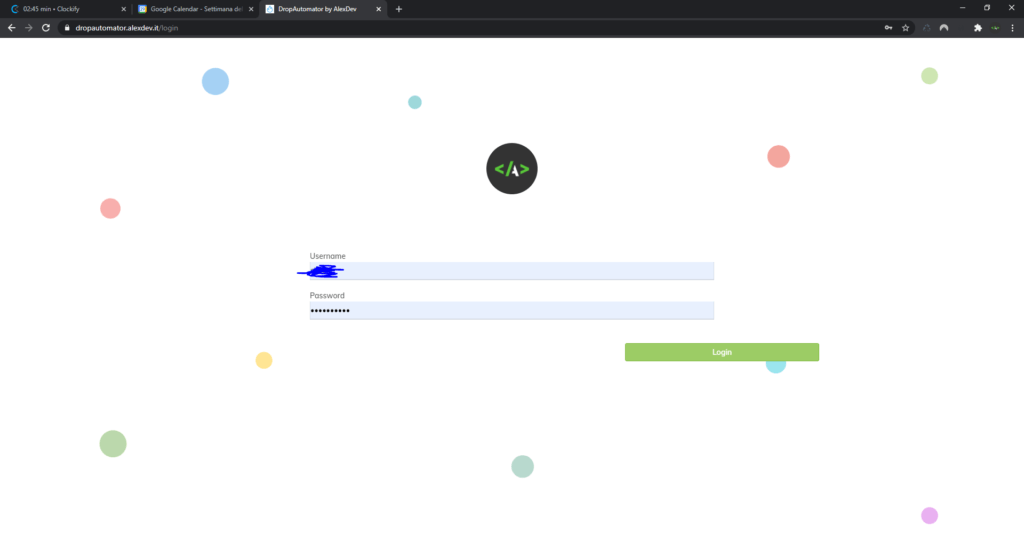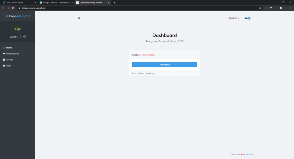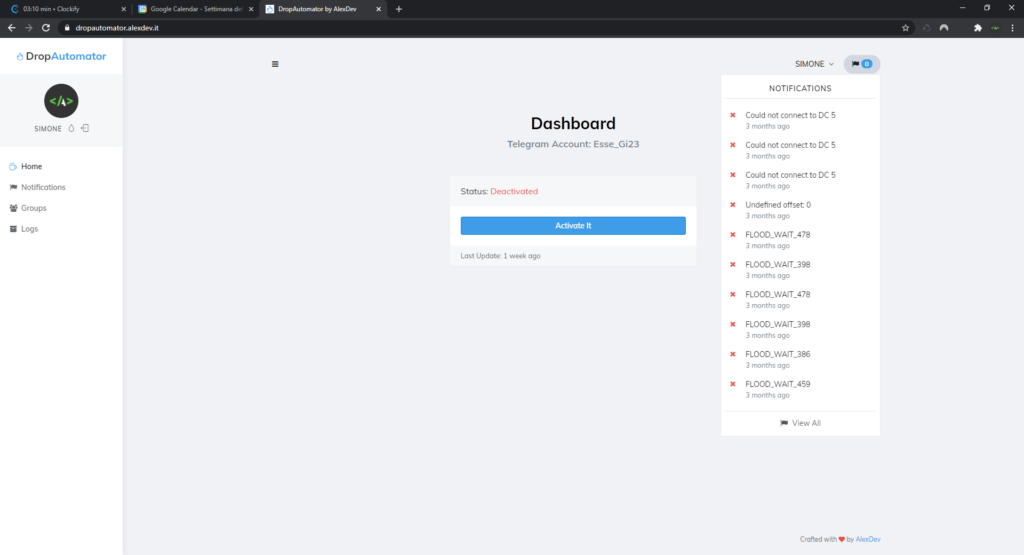 Dopo aver effettuato l’autenticazione, si ha accesso ad un’interfaccia semplice dove sarà possibile spegnere/accendere il bot, ed avere accesso alle notifiche (ESPANDIBILI per vederle tutte) ed al LOG (espandibile a sua volta)