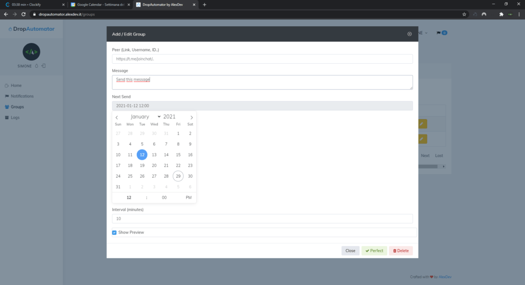 Tramite una pagina apposita, sarà possibile aggiungere una “Configurazione Gruppo” (Specificando ID, Username o Link del gruppo), messaggio da inviare, data del prossimo invio, ed intervallo di invio (quanto spesso inviare tale messaggio)