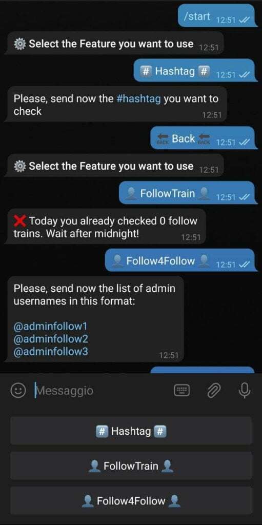- Follow4Follow, dove viene specificata una lista di utenti admin, ed una lista di utenti normali. Il bot controllerà che gli utenti normali si seguano l’un l’altro, e che seguano anche gli amministratori. Il sistema restituirà tramite messaggio telegram le statistiche degli utenti (per ogni utente, quanti admin hanno seguito, e quanti normali hanno seguito. Se li hanno seguiti tutti sarà presente una spunta verde vicino al loro nome). Restituirà inoltre un file in formato .CSV contenente la lista di profili dimenticati per ciascun utente.