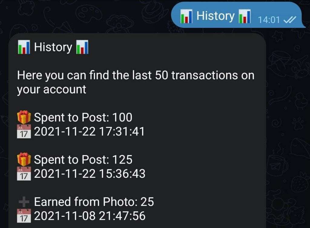 I punti saranno accreditati agli utenti ogni 5 minuti (o il tempo deciso dall’amministratore), senza che l’utente debba attivare il bot prima di farlo (gli utenti che non hanno ancora avviato il bot saranno registrati automaticamente quando pubblicano, e troveranno i punti nel proprio portafogli al primo avvio).