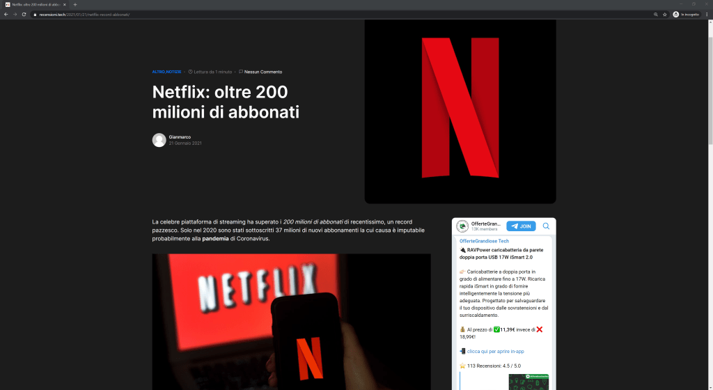 Sito web di notizie sul mondo tecnologico, con tema dinamico e responsivo, modalità light e dark, ed integrazione social networks esterni
