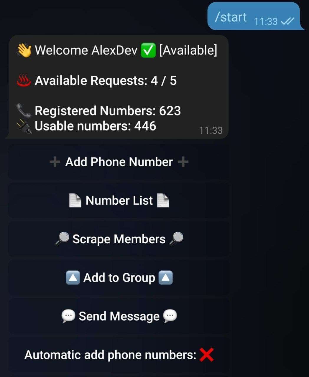 Uno dei bot più complessi e potenti che io abbia mai sviluppato è il popolarissimo Bot di Scraping, Aggiunta ed Invio Membri, in grado di ottenere liste membri attivi dai gruppi, aggiungerli ad altri gruppi, inviare loro dei messaggi, e molto altro ancora.